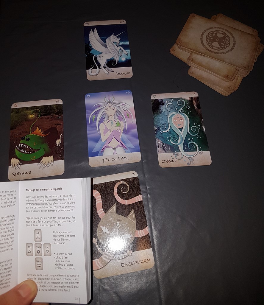Interprétation - En lisant la définition et le message de chaque carte en commençant par la Terre, puis Eau, Air, Feu et Ether. Chacune de ces Cartes va me donner un message, me parler de moi. Le Huelrog, espèce de charmant Chien, me dit fidèle, il me demande de faire appel à mes racines. La Nymphe me parle d'émotions, et ce qu'elle me dit me décrit beaucoup, mais comme toujours avec les informations d’introspection émotionnelle me concernant, j’ai du mal à la comprendre. La Licorne me raconte que mon désir de savoir me protège de mes peurs les plus profondes, et c'est très vrai. Le Phoenix me parle de la Mort, et vous n'imaginez pas à quel point son propos m'embête, tant il évoque quelque chose de très fort chez mois. Enfin, le Dragon du Feu finit de m'étaler, en en lisant la description, je reçois un message étonnant, parce qu'il me parle de manière très précise, et très intime...